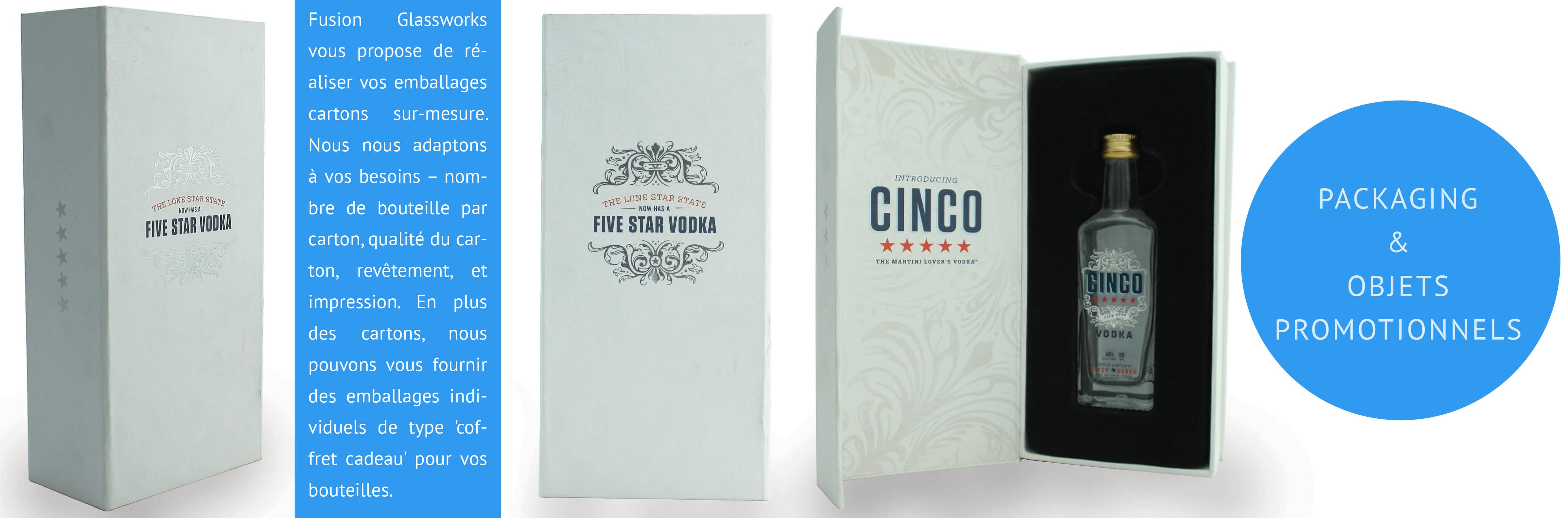 Nous offrons des cartons imprimés en 4 ou 6 couleurs effet naturel ou mat. Les bouteilles sont séparées par des croisillons en carton simples ou doublés.