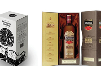 Cajas de regalo individuales para botellas. Estas pueden ser simples cajas de cartón impresas o elegantes estuches con puertas abisagradas e interiores satinados.